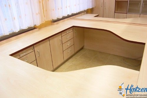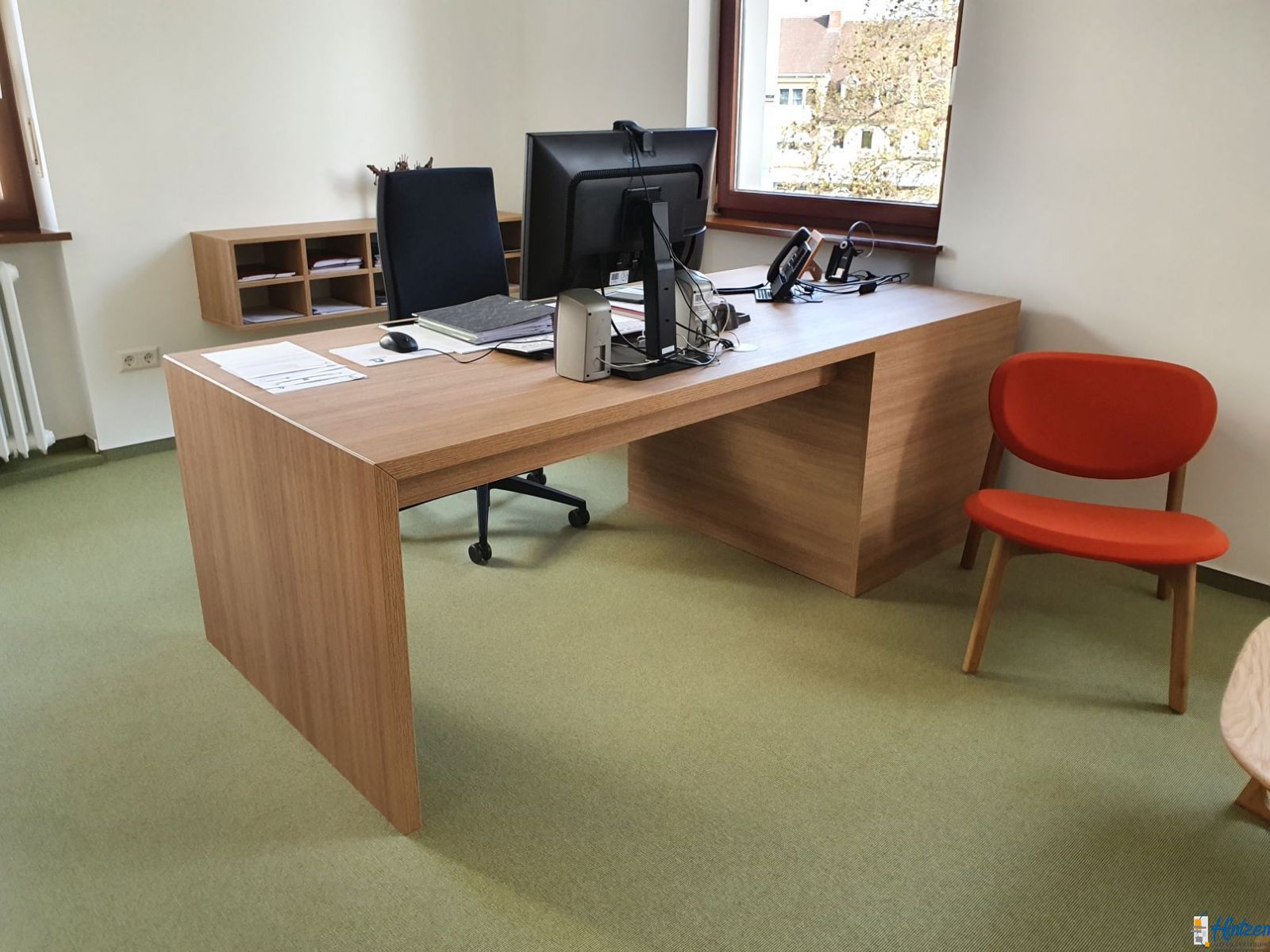 Büroeinrichtung (gewerblich) in Dekor Wildbirne aus eigener Fertigung. (Möbelkanten in weinrot, identisch der Firmen bzw. der Logofarbe) -